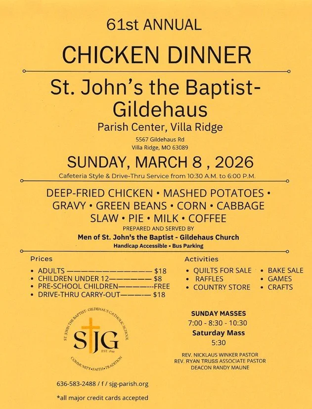 In the spring of 1965 St. John Gildehaus began holding their annual Chicken Dinner on the 2nd Sunday in March. Just like the sausage festival the Men are responsible for cooking and serving this wonderful meal. Come experience this marvelous meal that consists of Deep-fried Chicken, mashed potatoes, gravy, green beans, corn, cabbage slaw and homemade pies. Activities that are also available during the event are the Country Store, Craft Room, Pillow Room, Children’s Room, Bake Sale and Raffles.
